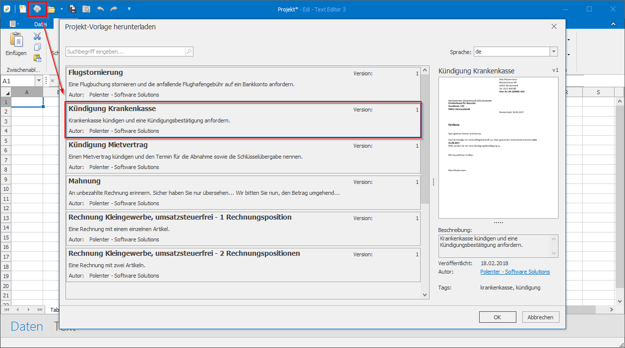 Sie können eine Dokument-Vorlage komplett neu erstellen, oder eine aus der Online-Datenbank von Edi herunterladen.